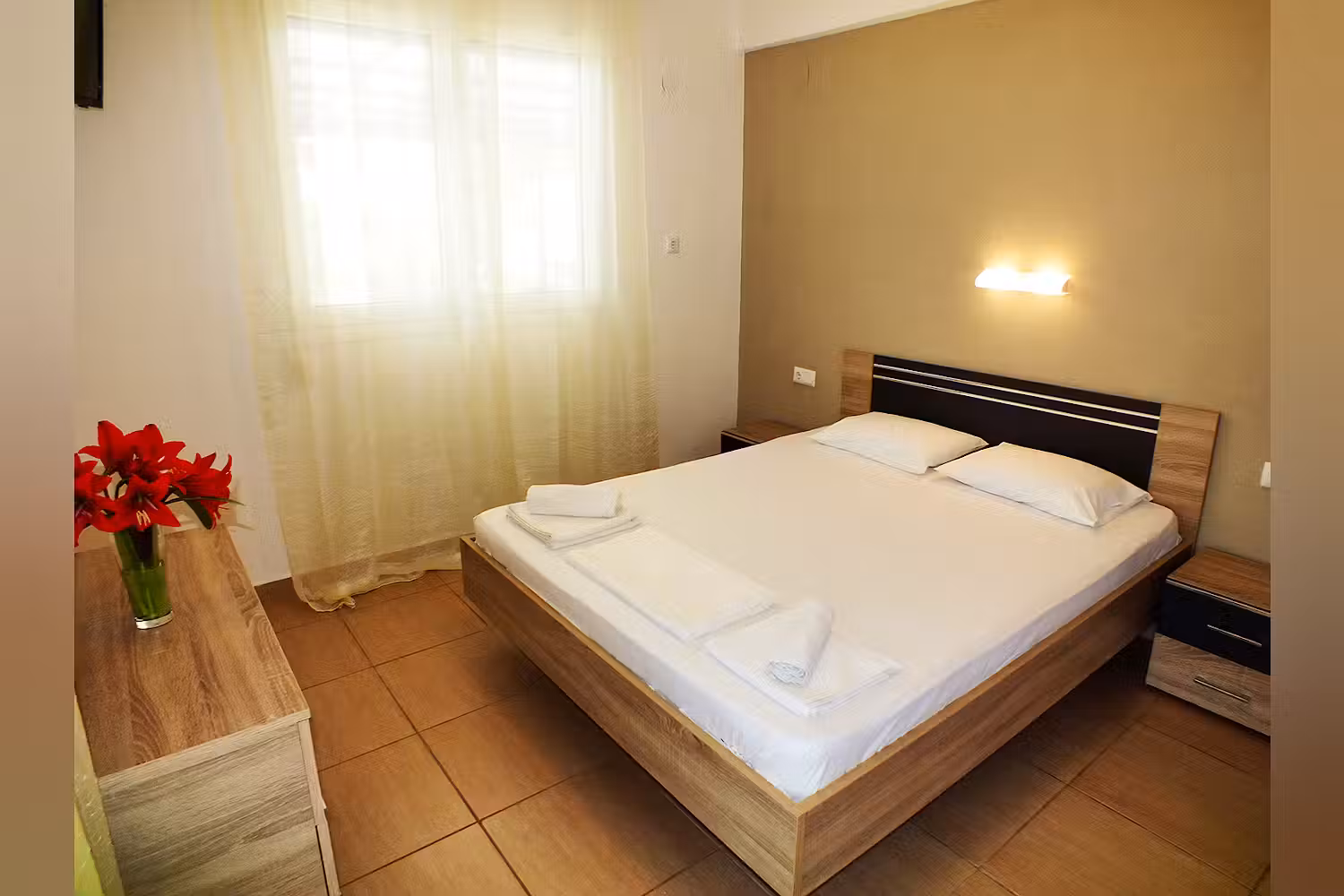 Our studios and apartments can sleep up to 4 people and include air conditioning, television, kitchen, fridge, water kettle, bathroom, and balcony with a beautiful view.